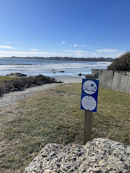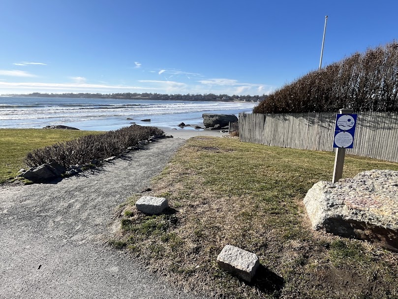 Gravel path and stone steps leading to sandy beach; located on private property. No parking, no pick-up or drop-off; nearest public parking at Dunlap-Wheeler Park (restricted to Middletown residents with beach pass from sunrise-4pm).